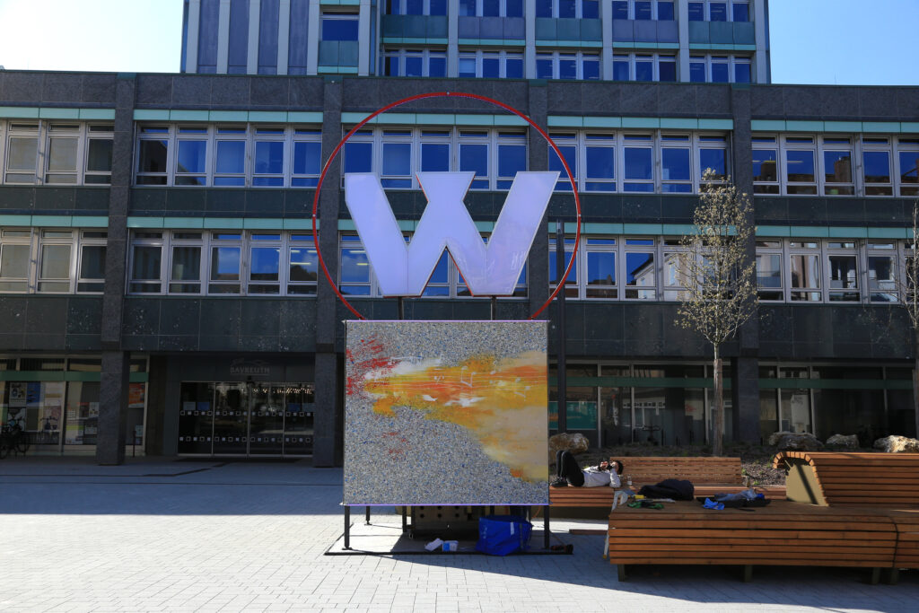 Malba zobrazuje barvy tónů a je zachycena na českém materiálu PackWall, deskách z recyklovaných nápojových kartonů. Kruh symbolizuje Der Ring des Nibelunge a hlavní prvek – velké „W“ – stojí jak pro …wie Wagner, tak název výstavy... With pleasure.