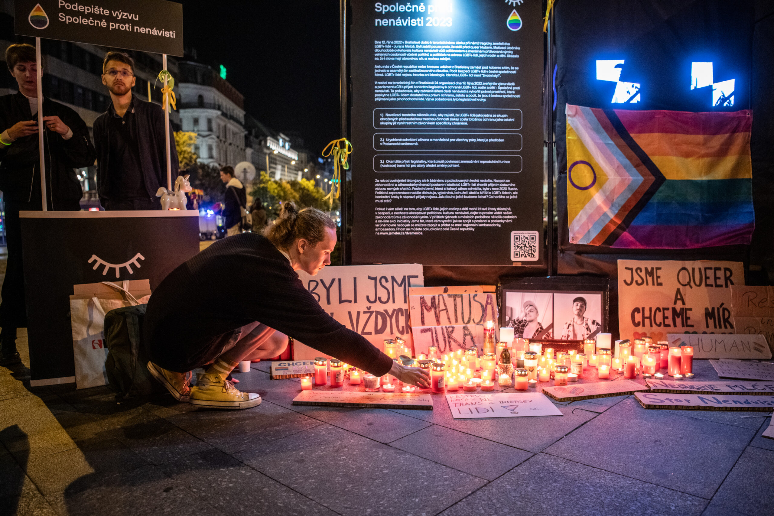 - října 2022 se dva mladíci, Juraj a Matúš, stali oběťmi teroristického útoku v bratislavském klubu Tepláreň. O rok později na stejný den se horní část Václavského náměstí v Praze rozzářila duhovými barvami. Připomněla tak jejich osud a zároveň poslala silný vzkaz o akceptaci a lásce.