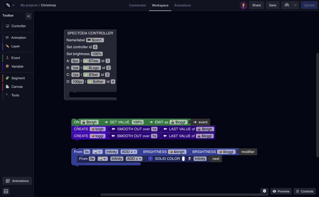 Animation definition starts, as all installations, in Spectoda Studio. This is a workspace we’ve built for light animations definitions and event handling logic. There, we define all the virtual devices in the scene (tree, logo, text) and a logic which handles interactions with toggle button and brightness slider in app, as well as all the animation definitions. The output we get from here is a .tngl file.