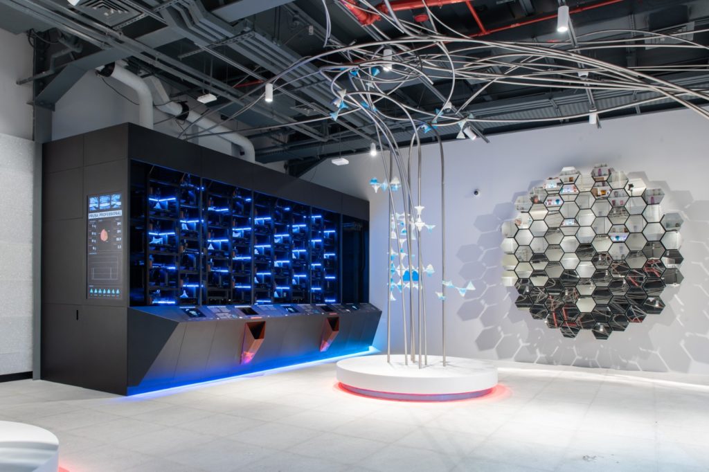 The Dubai installation can be seen from 1 October 2021 to 22 March 2022 at the Czech Pavilion at the EXPO 2020. In addition to the visual spectacle, it is possible to interact directly with the farm on site. A tablet is available for event participants to choose their own plastic snowflake. This will then be printed from fluorescent PLA by one of the 3D printers.