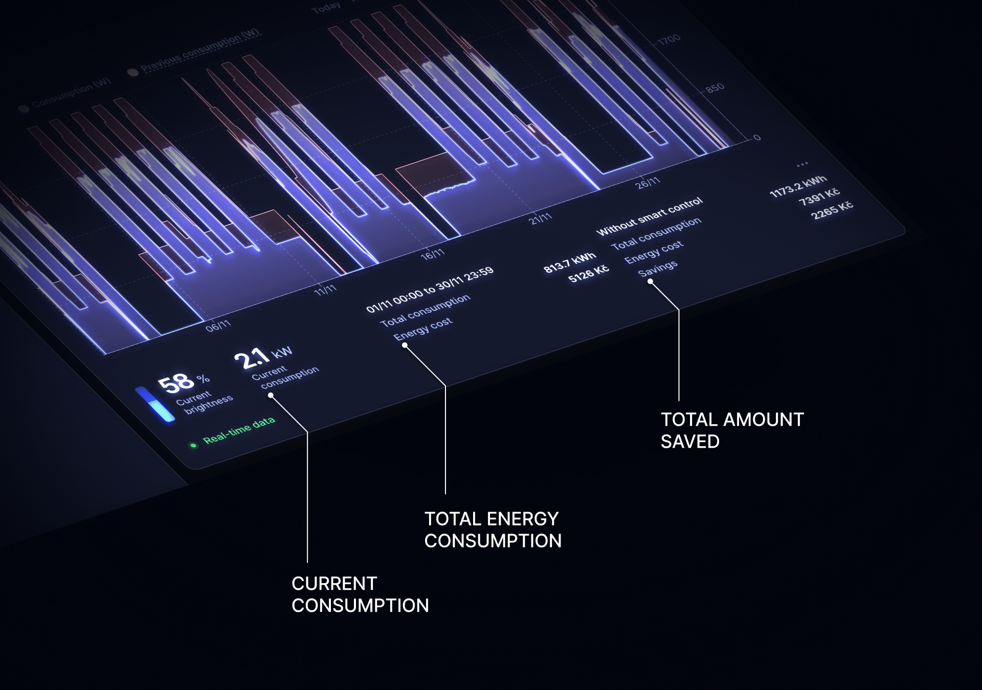 Spectoda Analytics is an advanced software that displays real-time data on the status and duration of each light fixture in your space. This tool provides an overview of the current lighting status and also allows you to compare costs with the situation if you were only using lights with the on/off function.