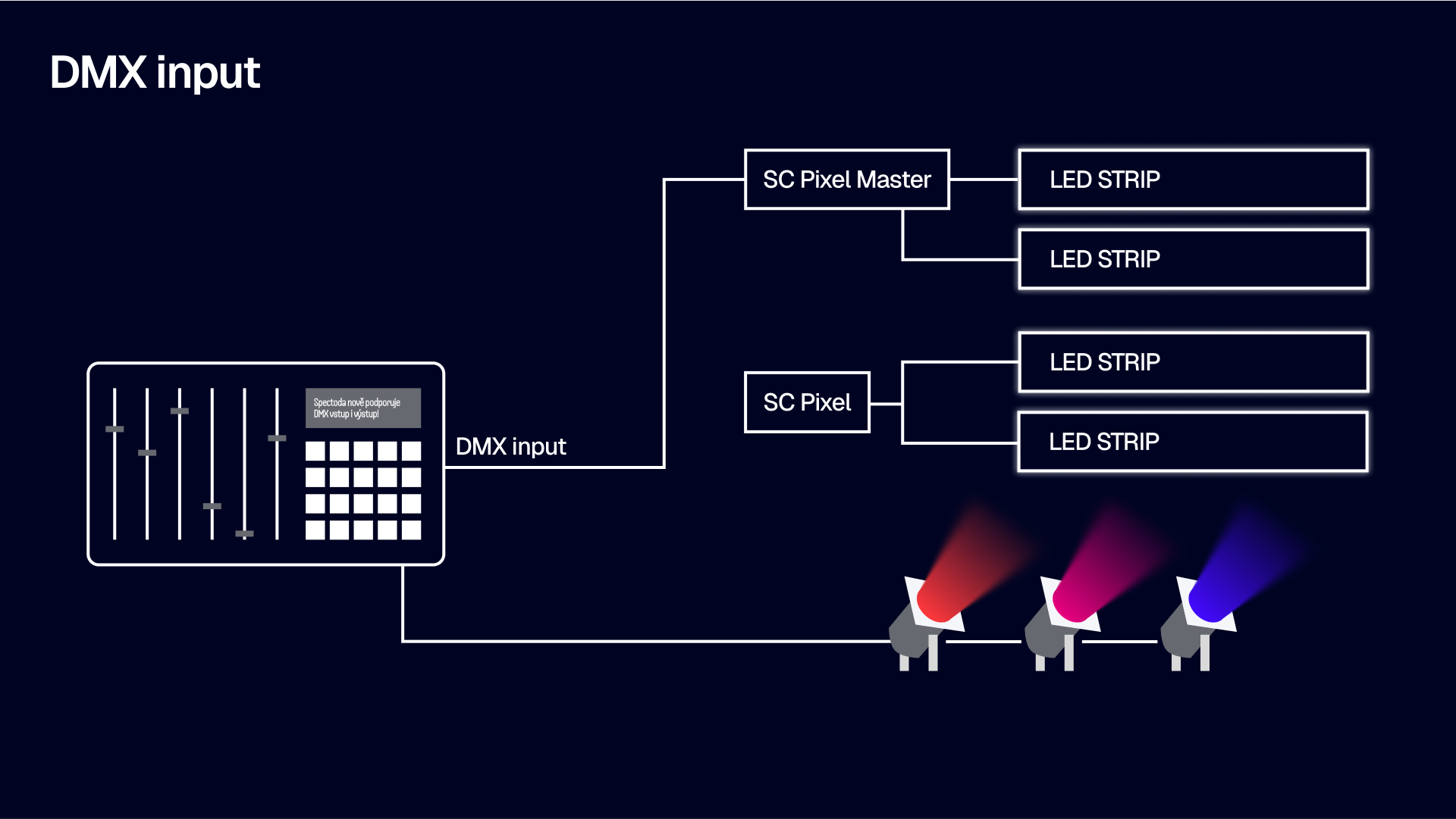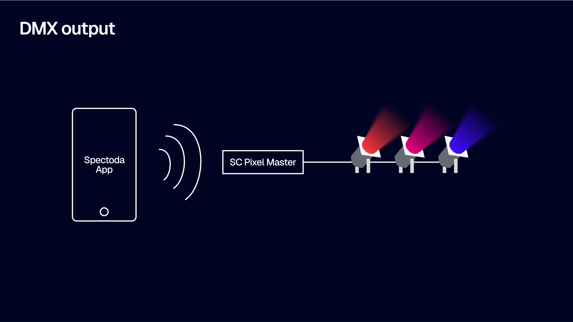 No compromises. You no longer have to choose between wireless freedom and a traditional console, between digital animation and standardized DMX. Spectoda is now fully compatible with DMX protocols – both input and output.