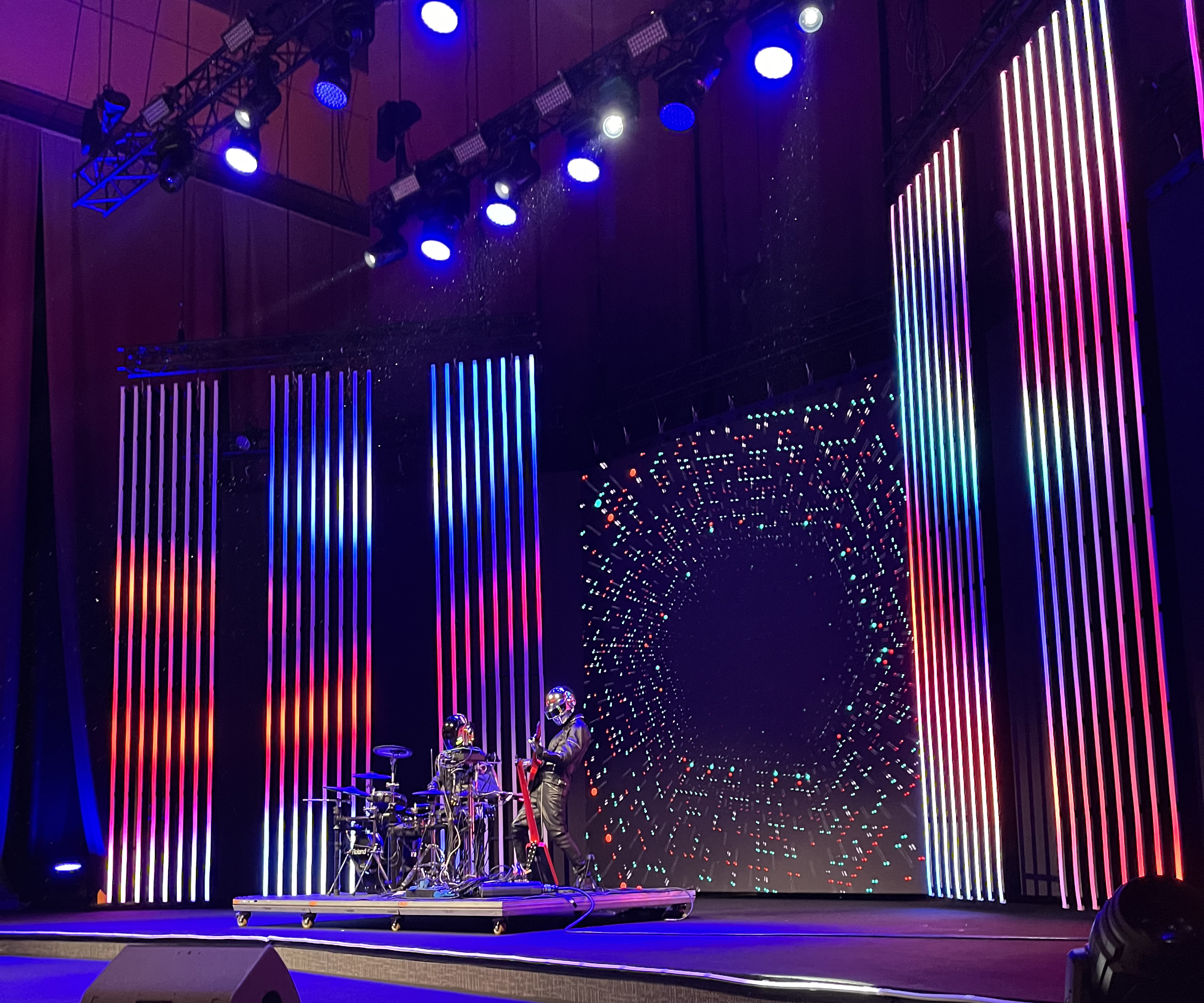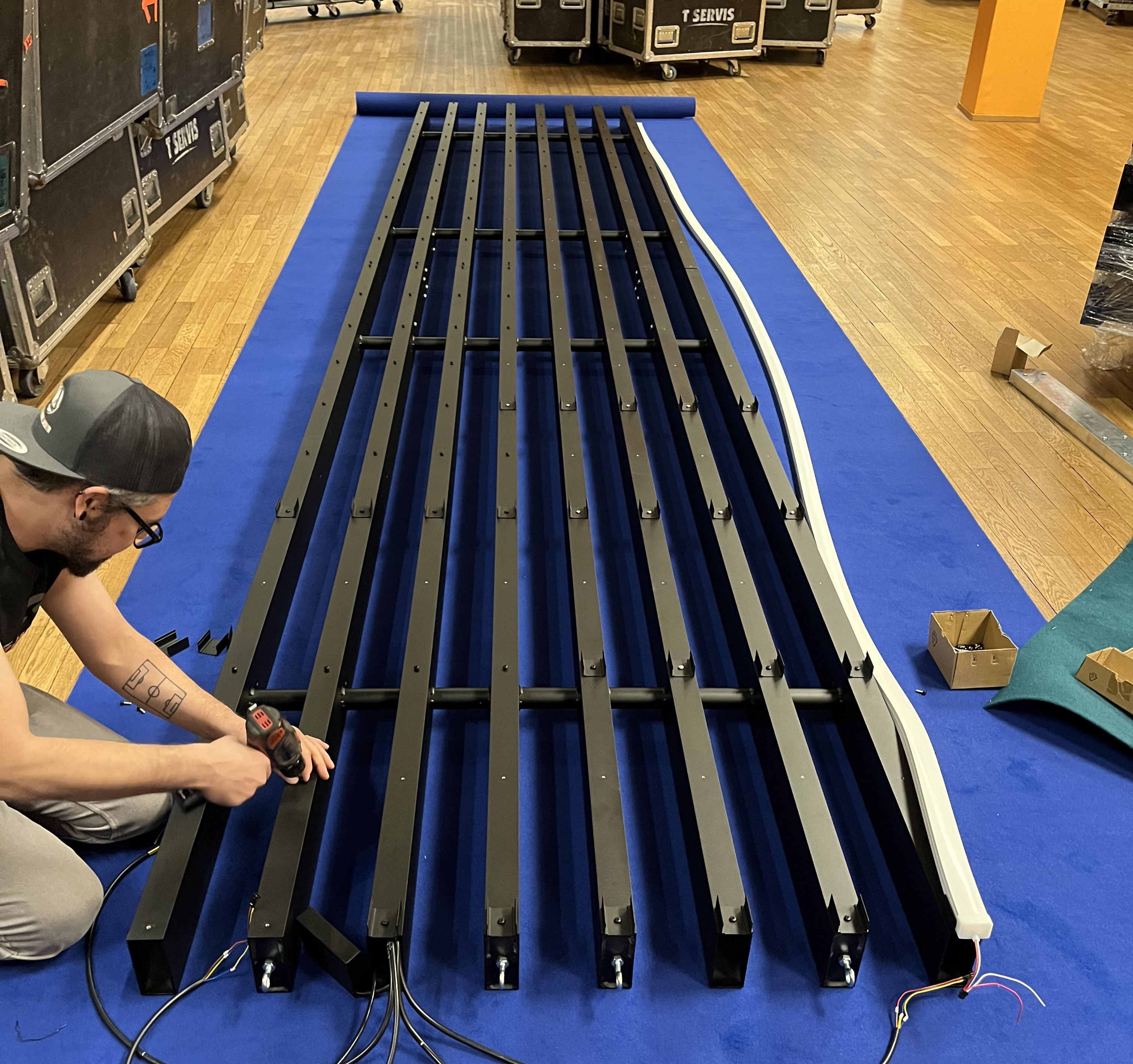 The main part of our implementation was 288 metres of digital LED strips that created an immersive atmosphere on stage. The installation had to be flexible and portable, which meant avoiding the usual aluminium diffusers. We designed the entire system to be easily transportable and reassembled for future events.