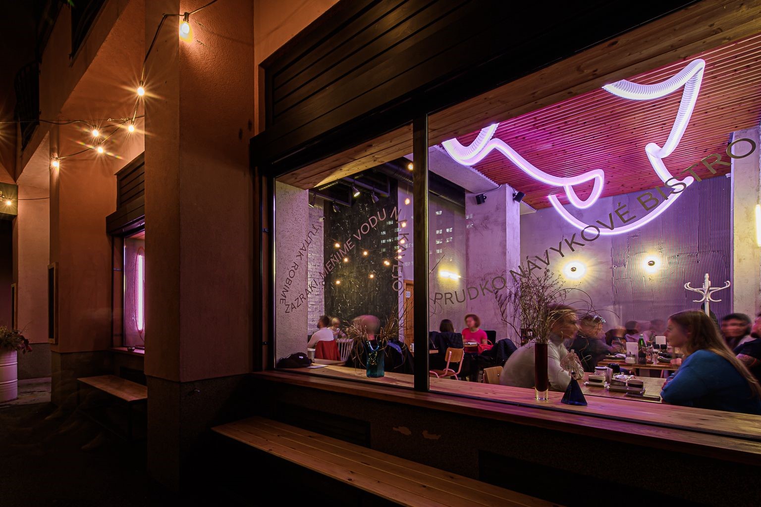 An installation in Bratislava's Grão café inspired the Nico Caffe in Prešov. The owner Josef Kaňuk was interested in a similar lighting design, which creates a unique atmosphere with its shape and dynamics. The result is chandeliers made of waste hose and vertical profiles with digital LED strips that can be controlled from a mobile app.
