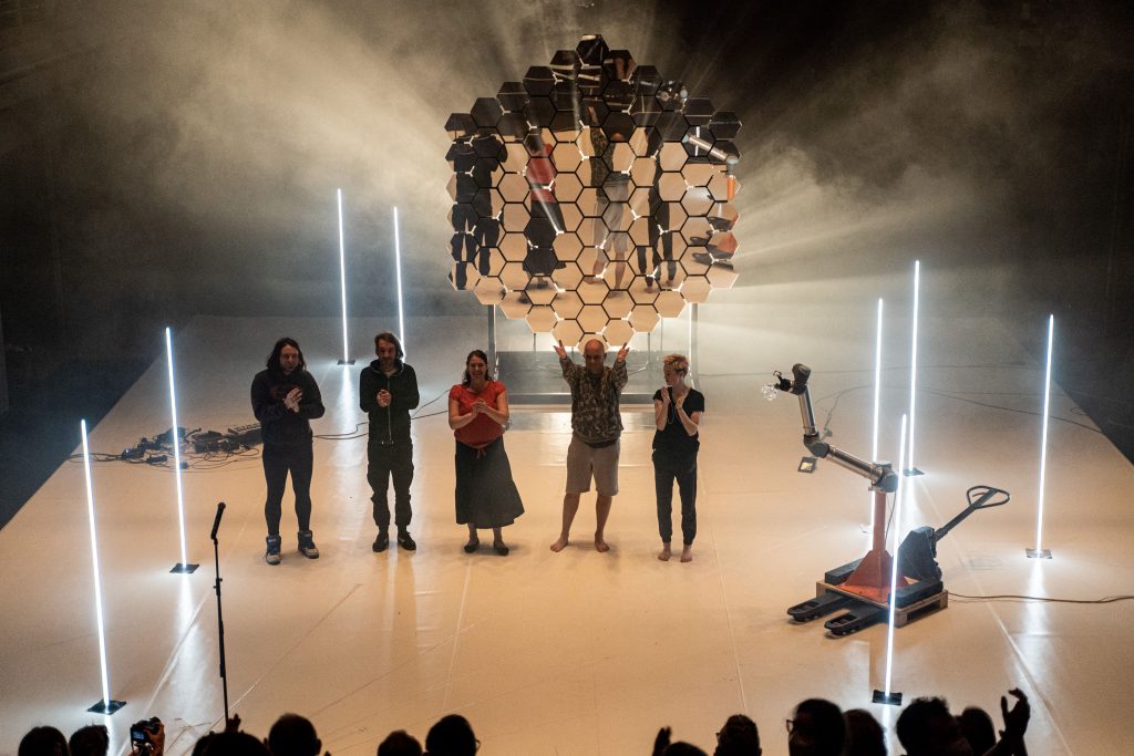 V rámci covidového programu „Nehrajeme, tvoříme!“ měli umělci možnost po několik dní zkoumat a testovat různé možnosti práce se světlem, s precizním laserem a se zvukem generovaným kinetickou sochou Reflexe. Kromě ní a našich tyčí se do vystoupení zapojí i lasery nebo například robotická ruka brnkající na piano.